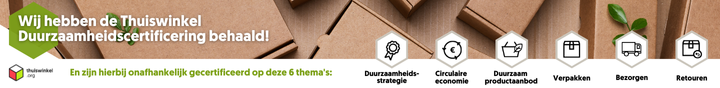 Wij hebben de Thuiswinkel Duurzaamheidscertificering behaald! Dit betekent dat wij op 6 duurzaamheidsthema's zijn getoetst: duurzaamheidsstrategie, circulaire economie, duurzaam productaanbod, verpakken, bezorgen en retouren. Bekijk hier het duurzaamheidscertificaat.